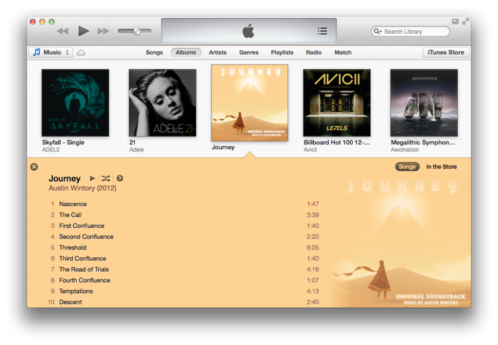 الموسيقى التصويرية (SoundTracks) أحد أهم عناصر اللعبة، بل من دون الموسيقى سوف تكون اللعبة… لن أقول سيئة، لكن سوف تبدو ناقصة، الموسيقى من الفنان Austin Wintory أوستن ونتري، وقد أبدع في دمج هذه الموسيقى الشاعرية في المراحل وتناسقها مع البيئة وما تواجه، في المراحل التي تواجه بها صعوبة في السير سوف يكون هناك موسيقى مخصصه ومناسبه وفي المراحل التي ربما تواجه بها الصعوبات وبعض الوحوش سوف تتسارع النغمات والموسيقى بشكل أكثر من رائع، الموسيقى في نهاية اللعبة تنخفض لتجعلك تفكر لوهله. في الحقيقة في نهاية اللعبة، مع عدم وضوح القصة والأحداث وعدم فهم ما يحدث قاربت على البكاء! موسيقى لامسه للمشاعر، اندماج عاطفي عالي لا يصدق مع الشخصية والموسيقى. موسيقى «جيرني» تساوي اللعبة، بدون هذه الموسيقى اللعبة تبدو ناقصة.