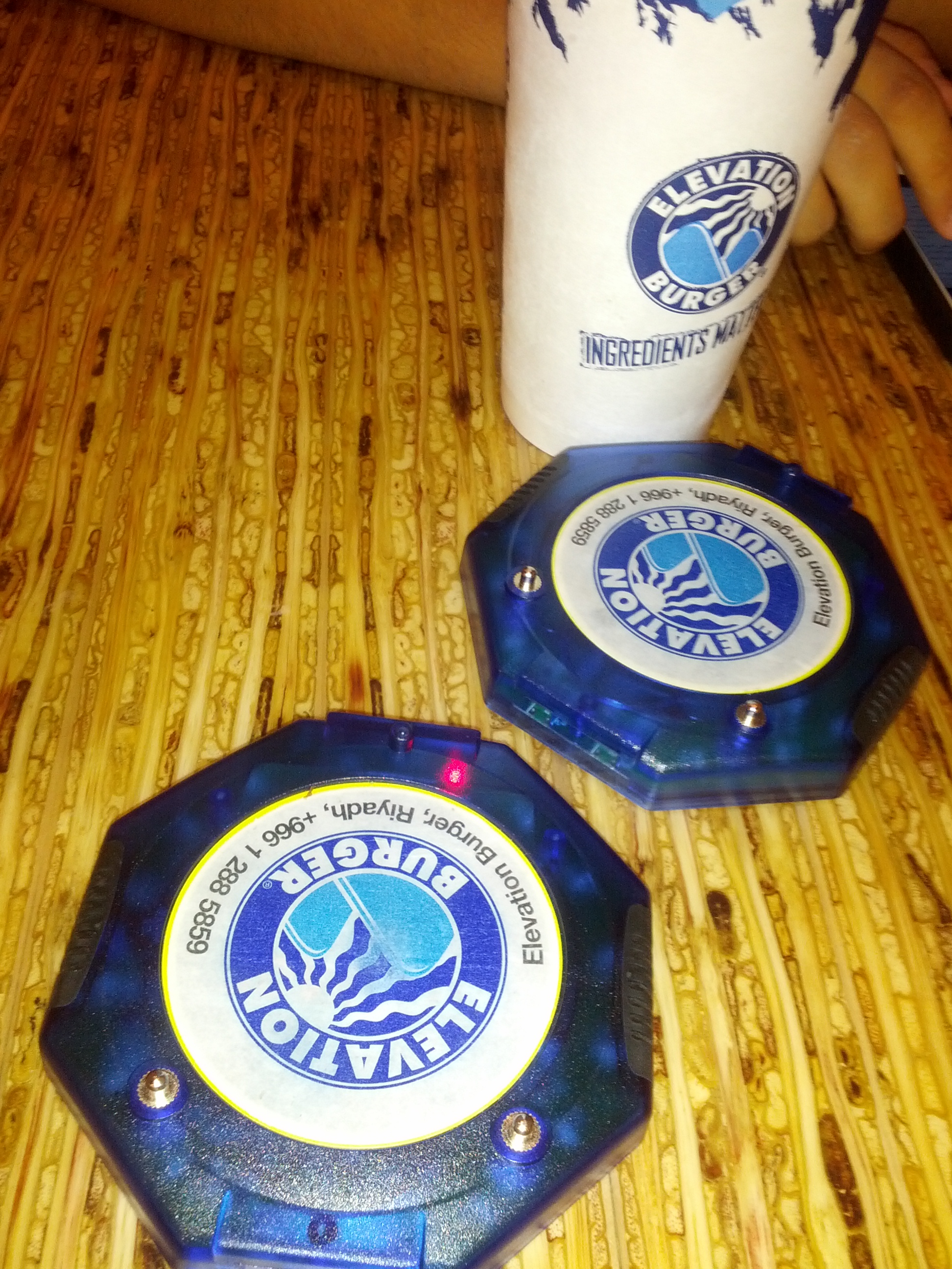 بعدها أعطاني الكاشير جهاز إلكتروني بلاستيكي أزرق غريب! شرح لي أن هذا الجهاز سوف يهتز ويضيئ وبنغمة تنبيه عند انتهاء طلبك. انتظرت مع سلطان وأحد زملائه أيضًا حتى رن الجهاز وقام يهتز ويخرج أصوات تنبيه وفي هذه اللحظة، في لحظة التنبيه يخرج النادل من المطبخ مستدلًا على صوت الجهاز حتى يصل لطاولتنا وبها ما طلبنا. فكرة غريبة ولكن مسلية وفريدة بنفس الوقت.