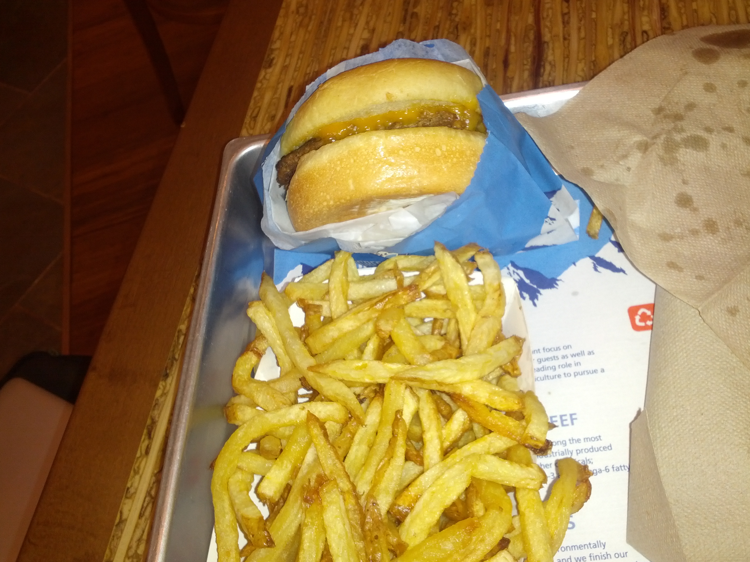 صفيت في الطابور الطويل نوعًا ما بدأت أقوم بأخذ الصور للمطعم من الداخل. فجأة وجدت صديقي سلطان في الصف أمامي سلمت عليه وأخذ سلطان طلبه وما زلت أنا أنتظر وصلي للنادل/الكاشير لكي أقم بطلب ما أريده. وصلت بعد وقت طويل قليلًا وقمت بطلب تشيز برجر، عبارة عن برجر بقطعة لحم واحدة مع الجبن وعند إضافتك الخس وغيره يرتفع السعر وهكذا هي سياسة وآلية المطعم في الطلب. يجب أن تعرف أن خضارهم طازجة و"فرش" كما يقولون في لوحاتهم في المطعم وكذلك الكثير من، من قام بتجربة المطعم. طلبت إضافة الخس فقط وطلبت أيضًا البطاطس الطازجة ومشروب كاكا كولا. السعر كان ٤٥ ريال سعودي قمت بفتح محفظتي ولم أجد معي غير ٢٥ ريال فقط! سألت الكاشير هل لديكم شبكة لكي أستخدم بطاقتي الائتمانية؟ وللأسف لا يوجد شبكة ولا حتى صرافة قريبة —لا أعلم لماذا لا يوجد شبكة في مطعم مثل هذا!؟— عمومًا، لم يُقصر معي صديقي سلطان وكمل المبلغ، شكرًا سلطان!