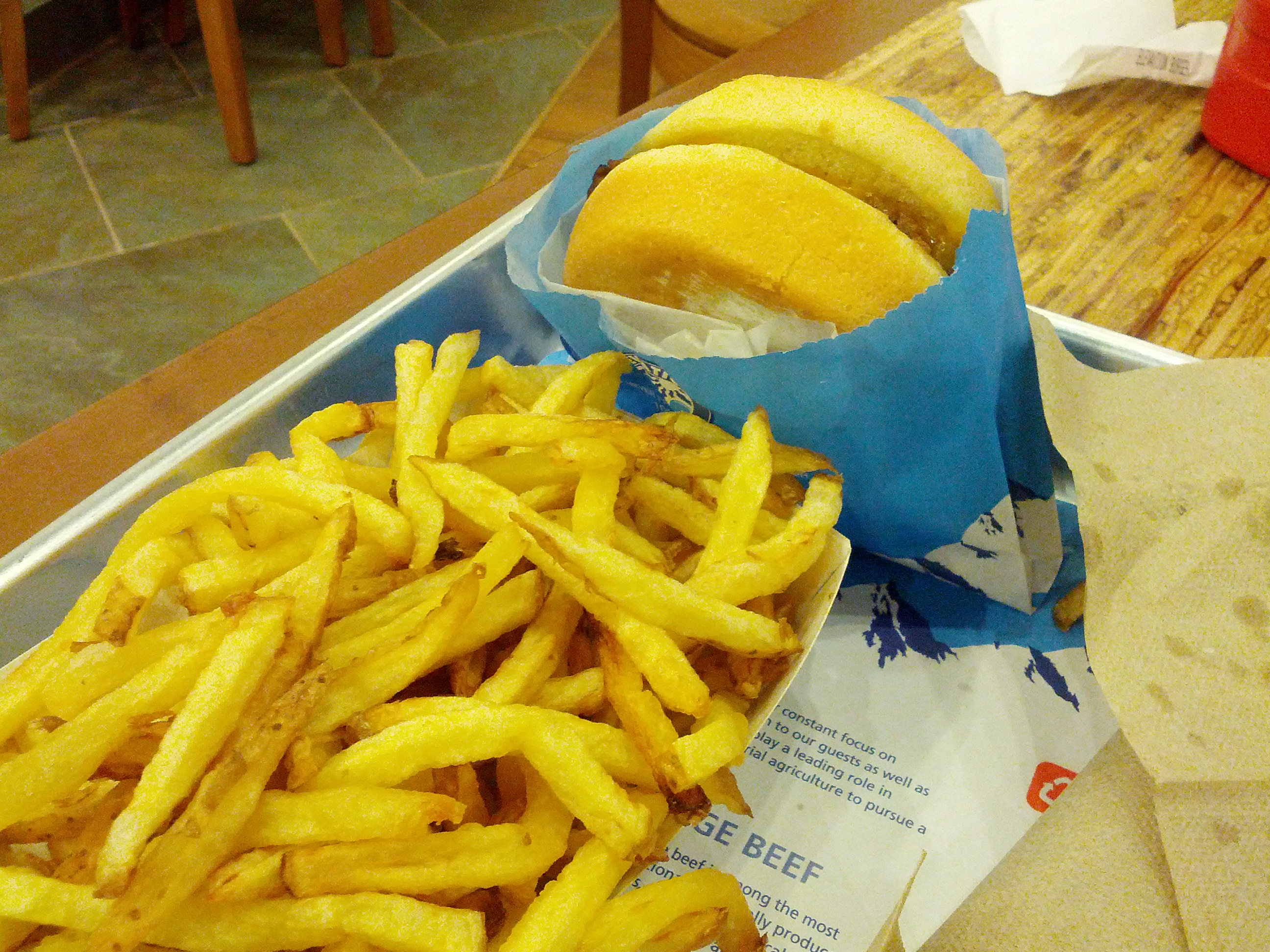 توقعت أن تكون الفرنش فرايز French Fries مقرمشة كما في برجر كنج وغيره من المطاعم. لكن، استغربت أن البطاطس أتت طازجة وتم تقطعيها من قبلهم دون تتبيل. لا أعلم ما الفرق هنا وكيف أوضحه لكن هناك بطاطس تكون جاهزة ومتبله مسبقًا ومختلفة عن البطاطس التي تُقطع يدويًا. الفرنش فرايز عادة تكون مقرمشة وصلبه من الخارج وطريه من الداخل —وهي ما أفضله دائمًا— أما البطاطس الطازجة المقطعة من قبل الطباخين تكون عادة ملتوية وطرية وتكون نيه قليلًا.