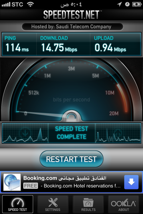 أعتقد أن أغلبكم سوف يقول لي: “طيب شركة الإتصالات السعودية تقدم نفس الصفحة”. نعم، تقدمها لكنها ليست مرتبة بشكل مميز وبواجهة مميزة كالتي توفرها شركة زين. حتى أن تصفحها صعب أنا أقصد صفحتهم Jawalnet.com.sa. ما يعيبها أيضًا صعوبة الوصول لكل شيء. لأن الكثير من الخدمات الغير مرغوب بها “تم حشرها” -خدمة أبواب و…الخ.- مع الأساسيات مثل معرفة رصيد البيانات أو تفعيل الباقات و…الخ. إليكم بعض قياسات السرعة من منطاق مختلفة من مدينة الرياض: