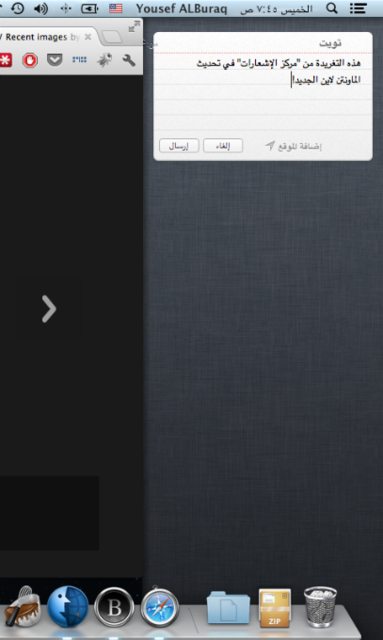 واحدة من أهم وأجمل الخصائص الجديدة مع تحديث ماونتن لاين، هو مركز التنبيهات Notification Center فهو تمامًا يعمل بنفس طريقة عمله على الآيفون والآيباد. فهو المكان الذي يتم ترتيب جميع التنبيهات التي تأتيك فيه، في مكان واحد دون تشتت. تأتيك تغريدة جديدة؟ سوف يظهر لك تنبيه بها من الجهة العلوية في اليمين على شاشة الماك واذا تركتها سوف تتأرشف في مركز التنبيهات. بمجرد تحريك أصبعيك لليمين على التراك باد TrackPad أو الماحك الماوس او عن طريق الضغط غلى زر مركز التنبيهات في البار العلوي في النظام سوف تظهر لك القائمة بالخلفية الرمادية الجميلة المعروفة من آبل وجميع التنبيهات التي لم تراها سوف تكون موجودة هناك! خاصية جميلة ورائعة ولا أنكر أني كنت منتظر لها بك لحماس. حتى الآن ليست جميع التطبيقات تدعم وصول التنبيهات على مركز الإشعارات ولكن هي مسئلة وقت لا أكثر ومع التحديثات القادمة —شهر تقريبًا؟— سوف تكون أغلب تطبيقاتك المفضلة داعمة لمركز التنبيهات. قبل وصول هذه الخاصية الجديدة من آبل أعتاد مستخدمي الماك على تطبيق جراول Growl وهو شهير جدًا، بل أحد أهم تطبيقات الماك بعد شرائك الماك يجب عليك أن تقوم بتحميلة فهو يؤدي نفس الوظيفة ولديه دعم من أغلب التطبيقات أن لم يكن جميعها. يظهر لك التنبيهات ويمكنك من التحكم بطريقة ظهورها والمزيد. بالمناسبة، الكثير يرى أن مركز التنبيهات لا يغني عن جراول نظرًا لخصائص جراول الكثيرة مقارنة بمركز التنبيهات. شخصيًا، سوف أستمر على إستخدام جراول؛ لأنه حتى الآن مازال هناك المئات من التطبيقات داعمه له ولم تدعم مركز التنبيهات الجديد. لكن، بالنسبة للمستخدم العادي فلا فارق لديه فسوف يكون مركز الإشعارات مناسب له بكل تأكيد. حتى الآن هناك تطبيق واحد في سطح المكتب لدي يدعم مركز الإشعارات الجديد وهو تطبيق تويت بوت Tweetbot للماك بنسخته التجريبية ويظهر بشكل مميز وجذاب بصراحة كما ترون في الصور بالأسفل. أوه! نسيت شيئًا، هنالك زر تغريدة “Tweet” لإرسال التغريدات مباشرة من مركز التنبيهات بدلًا من فتح تطبيق تويتر أو الدخول من المتصفح و…ألخ. فقط بضغطة زر ترسل تغريدة. وسوف يكون فيس بوك كذلك بنفس الآلية، لكن لن يصل فيس بوك لمركز الإشعارات إلا في الخريف —أي بعد شهرين تقريبًا أن لم أكن مخطئ—.