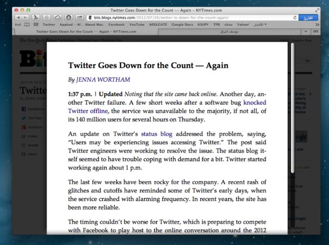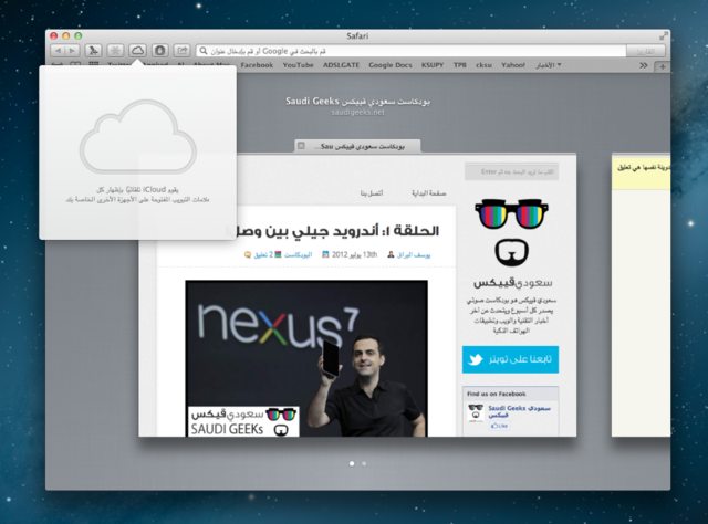متصفح سفاري حصل على جرعة تحسينات مثيرة للإهتمام. تم دمج زر المشاركة وتم إضافة الآي كلاود مع سفاري لتتمكن من مزامنة الألسنة “Taps” مع الآيفون والايباد. على سبيل المثال: قمت بفتح 3 ألسنة على سفاري وتركت الماك وفتحت متصفح الآيفون أو الآيباد سوف تظهر لك الألسنة الثلاثة التي فتحتها على الماك! نعم تتزامن الأجهزة مع بعضها البعض. لكن، للأسف الخاصية سوف تعمل من جهاز ماك لجهاز ماك فقط —حتى هذه اللحظة— لأنه يجب أن تحصل على تحديث الـiOS6 السادس للآيفون والآيباد لكي تتم المزامنة معهم أيضًا والتحديث سوف يأتي في هذا الخريف. سوف ننتظر شهرين تقريبًا على وصول التحديث. هناك أيضًا تحسينات في الواجهة مثل زر القارئ “Reader” الذي يعرض لك محتوى المقال الذي تقرأه فقط بواجهة جميلة ويحذف لك كل المشتات في الصفحة مثل: الإعلانات والصور المشتته وغيره. تم دمجه الآن وتغير شكل الزر ووضعه بجانب البار العلوي الذي تكتب فيه عنوان المواقع. كذلك أصبح تحميل الصفحات التي تتصفحها مقارب لشكل الآيفون والآيباد فسوف يظهر لك الخط الأزرق متحركًا للإمام ليخبرك ما إن تم تحميل الصفحة أو ما زالت تُحمل. “أزيدك من الشعر بيت” الآن البار العلوي الذي تضع به عناويين المواقع أصبح مثل متصفح كروم فتقوم بالبحث عن أي شيء في قوقل عبر كتابة ما تريد البحث عنه فيه والضغط على إنتر ليوجهك مباشرة لصفحة النتائج على قوقل! —أتمنى أن أرى هذه الخاصية أيضًا في سفاري على الآيفون والآيباد وإزالة مربع بحث قوقل الذي يظهر في أعلى يمين الشاشة دومًا وإستبداله بزر القرائة على سبيل المثال—. سابقًا كان متصفح سفاري على الماك بطيء بشكل قاتل وكذلك “يعلق ويهنق” بشكل ملحوظ وليس خفيفًا عند الفتح مثل متصفح كروم Google Chrome. الآن أصبح يقلع بسرعة ويحمل الصفحات بشكل سريع وملحوظ وتعامله مع فيديوهات الفلاش أصبح أفضل من السابق بشكل ملحوظ. هناك أيضًا تحسين لخاصية الإحتفاظ بالصفحات لقرائتها لاحقً على سفاري 6 فالآن عند إضافة صفحة في قائمة القرائة لاحقًا، سوف يوفرها لك سفاري على جميع الأجهزة بدون الحاجة للإتصال بالإنترنت، بل سوف تكون محفوظة —مثل تطبيق أنستابيبر Instapaper وبوكيت Pocket وغيرة—. هناك طريقة عارض الألسنة “Tap View” الجمالية جديدة في عرض الألسنة المفتوحة أيضًا. تبدو جميلة في الحقيقة.