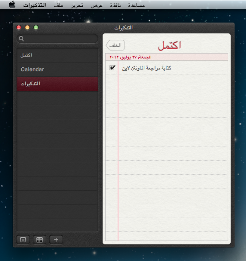 كذلك تطبيق iOS آخر على الماك. فالآن تطبيق المهام الرسمي من آبل يزامن مهامك وملاحظاتك بين الآيفون والآيباد والماك بسهولة —رغم أني لا أستخدمه؛ لأنه لا يعطيك الكثير من الخصائص والمميزات مقارنة بتلك المتوفرة في متجر التطبيقات مثل: 2Do, Tasks وغيره—. لكن أن كنت مستخدم له بشكل أساسي فسوف تكون سعيد بهذا التطبيق الجديد على الماك.