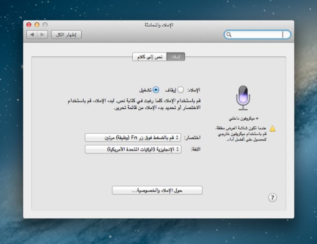 تبدو كسيري Siri ولكنها ليست سيري بالطبع. هي خاصية تسمى بالإملاء “Dictation” بحيث أنك تتحدث للماك باللغة الإنجليزية —لا يوجد لغة عربية حتى الآن—. ويحول الماك لك صوتك إلى نص مكتوب! لا داعي للتعب وكتابة الرسائل الطويلة بعد الآن. فقط عبر ضغطك على زر Fn مرتيين متتاليتيين. سوف يظهر لك مربع خاصية الإملاء لبدأ التحدث. أنتهيت؟ أضغط إنتر Enter أو الرجوع Reterun وسوف يتحول كلامك لنص مكتوب. جربت الخاصية بشكل شخصي وكانت أكثر من رائعة، أن لم تكن أجمل الخصائص التي بالتحديث والتي سوف تُفيدني بشكل كبير حين كتابتي باللغة الإنجليزية. فأنا دائمًا أعرف التحدث باللغة الإنجليزية بطلاقة —ولله الحمد—. لكن تواجهني مشاكل عديدة عند الكتابة مثل: الأخطاء في الكلمات وأخد الكثير من الوقت للتأكد من سلامتها Check-Spelling وغيره. وعناء الكتابة والتعب. الآن بإستطاعتي أن أكتب رسالة باللغة الإنجليزية بشكل سريع وسهل وممتع أيضًا! بشكل خاص عند مراسلتي لبعض الأصدقاء الأجانب أو بعض المطوريين لبعض التطبيقات التي أستخدمها في إضاح مشكلة في تطبيقة و…ألخ. جربت الخاصية على الميكرفون المرفق مع الماك بوك برو 13 أنش والنتائج مذهلة وغير متوقعة. يخطئ الماك في بعض الكلمات —التي أعتقد أنها بسبب نطقي السيء من أصل سطرين 3 كلمات خطأ— لكن، قمت بتوصيل المايكروفون الإحترافي الخاص بي. بلو يتي Blue Yeti وضبطت إعدادات على إستقبال الصوت ونجحت في كتابة رسالة طويلة بخطأ واحد فقط حين تهجأتي لحروف عنوان مدونتي YousefA.com فقط. خاصية مميزة جدًا وسوف أستفيد منها بشكل كبير هذا غير توفير الوقت لي في كتابة الإيميلات الطويلة كما ذكرت سابقًا. —أجد أن هذه الخاصية لوحدها تستحق التحديث للماونتن لاين لأجلها؛ سوف تُصدم من فاعِليتها!—.
