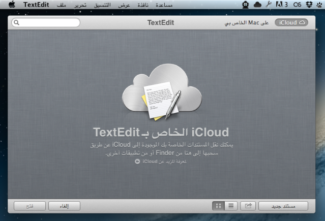 آي كلاود ليست بخاصية جديدة على الآيفون ولكنها الآن متوفرة على الماك —نعم توفرت على لاين. أعلم ذلك— لكن الآن أندمجت بشكل أفضل بكثير من السابق. آي كلاود على الماك والآيفون سابقًا لا يمكنك من إستخدامه لرفع ملفاتك الخاصة كمثال: (ملف نصي TXT). بل كان محدودًا فقط على المزامنة لصورة وجهات الإتصال والتطبيقات بين أجهزة الـiOS و…ألخ. لكن، لا تستطيع أستخدامة مثل دروب Dropbox بشكل خاص. حسنًا، الآن مع الآي كلاود على الماونتن لاين بإمكانك رفع ملفات لسحابتك على آي كلاود! نعم، لكن، بشكل مختلف قليلًا حيث أنه لن تقدم آبل لك ملف “Folder” كما هو الحال مع دروب بوكس على سبيل المثيل. لا، آبل حددت بعض التطبيقات التي سوف تجعل لها طريقتيين في الوصول الى الملفات. الأولى وهي الإعتيادية عن طريق القرص الصلب “File>Open>Choose The File” أو وصولك لملفاتك عبر الآي كلاود وعند ضغطك على الآي كلاود سوف تظهر لك نافذة تخبرك أنه بإمكانك سحب أي ملف لديك وإفلاته “Drag And Drop” في النافذة وسوف يُرفع هذا الملف على الآي كلاود مباشرة، بل وتستطيع كما هو في أجهزة الـiOS أن تقوم بوضع ملف فوق ملف لتتكون لديك حافظة في الآي كلاود. وبالطبع بإمكانك الوصول للملف والحافظات بعد تسجيل دخولك على أي ماك آخر وفتح التطبيق أو حتى من خلال أجهزة الـiOS الأخرة التي تتشارك نفس الخاصية. آبل سمحت للتطبيقات بالوصول لهذه الخاصية وفي الصورة بالأسفل تطبيق محرر النصوص “Text-Editor” الإفتراضي على الماك ويظهر فيه نافذة الآي كلاود.