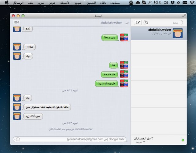 أسمه على أجهزة الـiOS معروف بآي مسج iMessages ولكن على الماك يسمى بتطبيق الرسائل “Messages”. عمومًا، التطبيق صدر سابقًا بنسخة تجريبية Beta وكان بها الكثير من المشاكل —ليس مستغربًا؛ لأنها في طور التجريبي—. الآن التطبيق يعمل بدون مشاكل ويعمل على إستقبال جميع الرسائل التي تأتيك على الآيفون أو الآيباد عن طريق آي مسج أو حتى الجي توك Gtalk الخاص بك. نعم، فلقد أصبحت جميع دردشاتك في داخل هذا التطبيق. يبدو، أن آبل قد حذفت التطبيق السابق للدردشة iChat والآن هو تطبيق الرسائل فقط. للأسف التطبيق الجديد لم يروق لي بتاتًا؛ معقد وغير سهل للإستخدام كما كان في السابق iChat —أتحدث عن iChat والذي دمج مع تطبيق الرسائل Messages مع التحديث الجديد—. تطبيق iChat كان واضحًا، سهلًا. تظهر أمامك قائمة بإصدقائك وتصنيفاتهم والحسابات وتقوم بضغط مرتيين Double-Click على جهة الإتصال “الصديق” ومباشرة تبدأ المحادثة في نافذة دردشة جديدة. أما الآن للأسف فالعملية أصبحت مختلفة قليلًا ومشتِته جدًا. يجب أن تقوم بالضغط على أيقونة أو رمز رسالة جديدة —تمامًا كالزر الي تضغطه لفتح رسالة جديدة في تطبيق الرسائل SMS على الآيفون—. وبعدها تقوم بوضع البريد الإلكتروني في فراغ المرسل اليه، كما هو على الآيفون أو تقوم بالضغط على زر الزائد “+” ويظهر لك تصنيفيين الأول -جهات الإتصال والثاني -الأصدقاء وفي جهات الإتصال جميع الأسماء التي حفظتها على جهازك وفي الأصدقاء تظهر لك حالة الأصدقاء إذا ما كانوا متصليين أو غير متصليين بالإنترنت لبدأ محادثة معهم. لا أعلم لماذا التقرب من طريقة عمل التطبيق للآيفون والتي أعتقد أنها فكرة سيئة من آبل؛ لأنه يجب معاملة تطبيق الكمبيوتر بشكل مختلف عن تطبيق الهاتف الذكي “الآيفون”. بالطبع لا مانع من إستيراد وتطبيق بعض الخصائص من الآيفون ولكن المشكلة في التطبيق الكامل والأعمى! عمومًا، تستطيع إسترجاع تطبيق الـiChat عبر ضغطك على cmd + 1 وسوف تظهر لك نافذة التطبيق العتيق. لكن، يجب أن تقوم بفتح تطبيق الرسائل “Messages” حتى تتمكن من فتح الـiChat. لا أعلم لماذا كل هذ التشيت و”البربسه” بصراحة. حتى هذا الوقت سوف أستعمل تطبيق Adium للدردشة فهو أفضل بديل عن الـiChat ومجاني أيضًا.